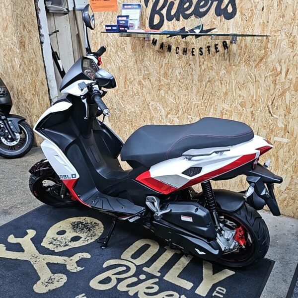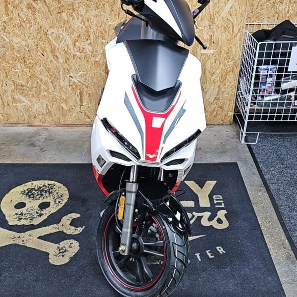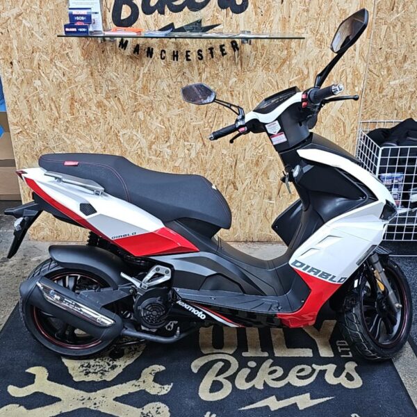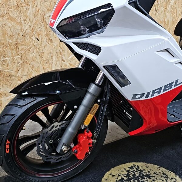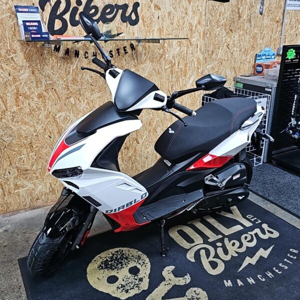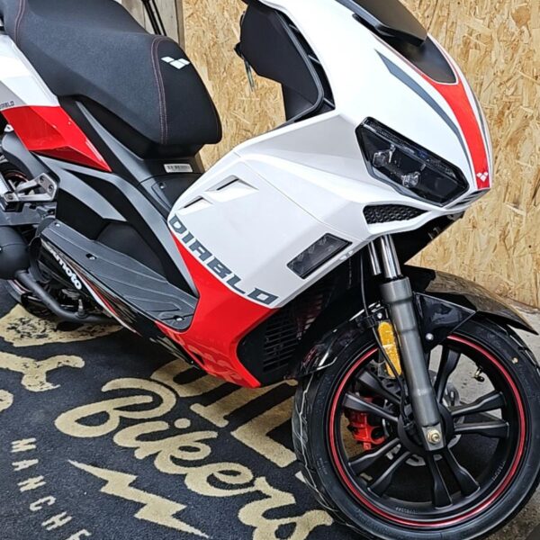 The racy 4 stroke engine packs a lot punch, and pair that with it`s lightweight frame the Diablo will have you flying off the line. A combined braking system with hydraulic disc brakes front and rear bring you to a safe and controlled stop every time. There’s a digital display and striking LED headlight unit that allows you to ride safely and illuminate the road ahead.